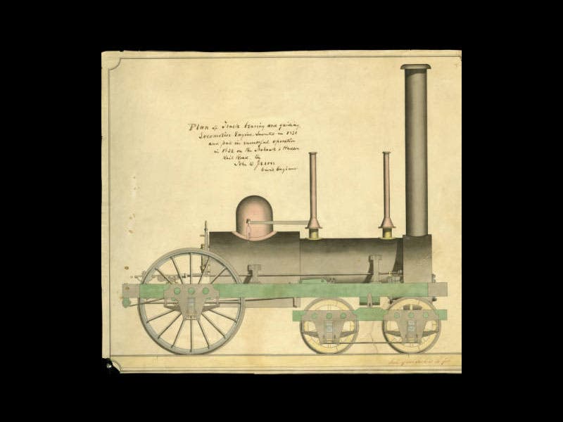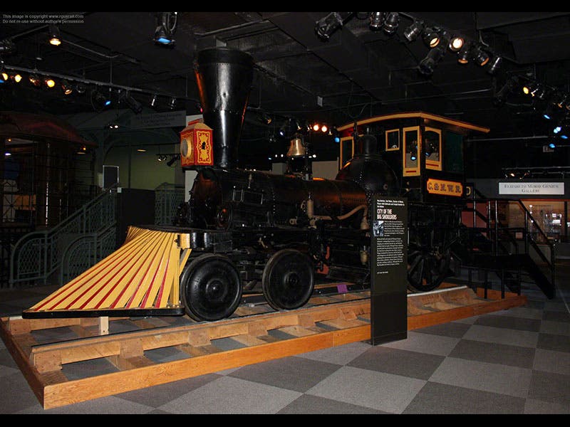 John Bloomfield Jervis, an American engineer, was born Dec. 14, 1795. Jervis was multi-talented, contributing to mechanical engineering, civil engineering and, through his estate, public education. Jervis became chief engineer for the Mohawk and Hudson Railroad in 1827, before there was a single mile of track in America. After the Liverpool and Manchester Railway was launched in England in 1830 (the first public railroad anywhere), Jervis imported one of their locomotives to the U.S., but found it was too heavy and could not negotiate the tight turns of American right-of-way. So he designed and built his own engine, called the Experiment. The novelty of his engine was in the mounting of the wheels; he cut the drive wheels down from four (on two axles) to two (on one axle), and he added a swivel four-wheel truck at the front to lead the locomotive around curves. It was the first 4-2-0 locomotive ever, and it served as the prototype for most American engines for decades, because it could negotiate just about any track. We see above Jervis’s original drawing for his 4-2-0 (first image), and a photo of a historic 4-2-0 (built in 1837, imitating Jervis) that is in the Chicago Museum of History (second image).