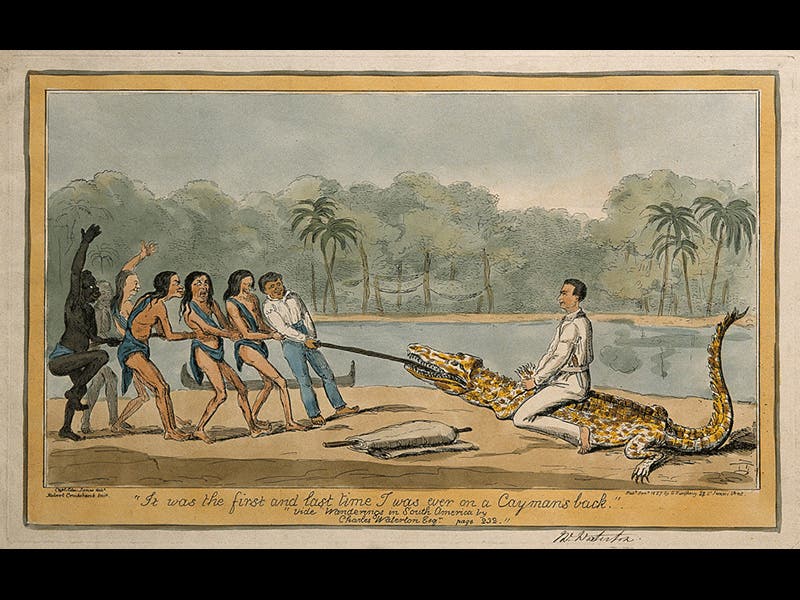 Waterton was an expert taxidermist, and he kept most of his specimens at his estate of Walton Hall in Yorkshire. In the 1830s, he walled in the estate and established the world's first nature preserve, stocking it with all sorts of exotic animals, especially birds. Visitors flocked to see his specimens, since he had described the capture of many of them in his book. They especially wanted to see the caiman alligator, which Waterton captured by leaping on its back and riding it to exhaustion. The deed was represented in several paintings, including one by Waterton himself (first image). The wonderful image was not included in his book, for some reason.