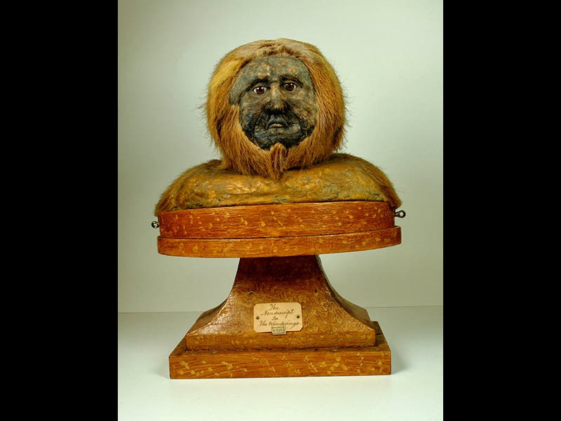 We have a first edition of Waterton’s Wanderings in the Library (third image). The frontispiece is very curious--a picture of what appears to be the head of a tiny wild man, with a leathery face surrounded by a hairy mane (fourth image). It is identified in the caption as “A Nondescript." In fact, Waterton fashioned the specimen from a howler monkey--only he used the rear end, not the head, to make his "Nondescript." The actual specimen is still on display at his manor house, Walton Hall (fifth image).