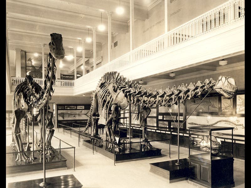 The Carnegie quarry became Dinosaur National Monument in 1915, although the site continued to be worked until 1925. When Andrew Carnegie died (1919) and the Carnegie Museum ceased to dig at Vernal, Douglass quit and went to work for the University of Utah--new employer, same site. In 1923, he turned up a large part of a skeleton known as Barosaurus lentus, a very rare species of sauropod. The skeleton was somehow divided up among 3 different museums, but in 1929 all the parts were acquired by the American Museum of Natural History (AMNH) in New York. The bones sat there for half a century, and then the museum unveiled a spectacular mount, right in the atrium entrance to the dinosaur exhibits (third image). Douglass's Barosaurus stands reared up on its hind legs, its head 45 feet in the air, trying to protect its skeletal young from a skeletal theropod. The mount is made of fiberglass, since the real bones are too heavy to mount in such a fashion, but the Museum does have the bones--Douglass's bones--to back up their mount.