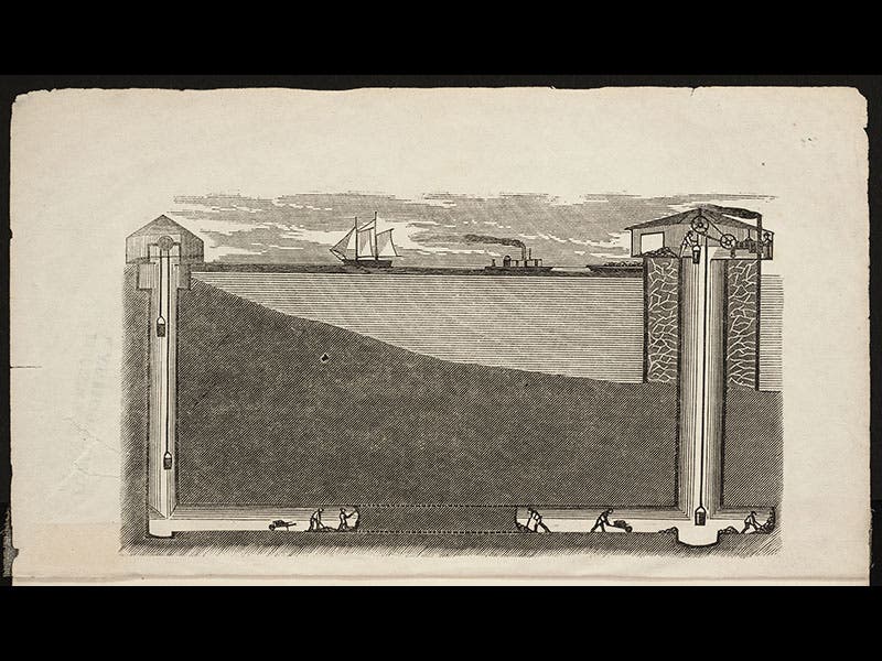 We have several publications in the Library about the Chicago Tunnel project. The first, The Great Chicago Lake Tunnel, was printed in 1867, before the tunnel was even opened, and some of the illustrations were probably imaginary, but it is still a charming little pamphlet, and the frontispiece shows the tunnel and crib in section (first image). As you can see, the tunnel was dug from both ends, complicating an already difficult task.