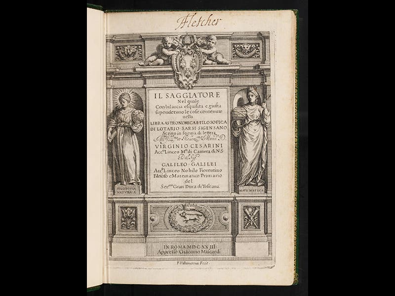 Francesco Stelluti, an Italian naturalist, was born Jan. 12, 1577. Stelluti was one of the founding members of the Accademia dei Lincei, or Academy of the Lyxes, organized in Rome by the nobleman Federico Cesi in 1603. This is often considered the world's first scientific society. Its most famous member, Galileo, was invited to join in 1610, after his success with the telescope. Galileo was honored to be included, and thereafter he always identified himself as “Galileo Galilei, Lincean,” and the Academy's emblematic lynx can be seen on the title page of his Saggiatore (Assayer) of 1623 (fourth image above).