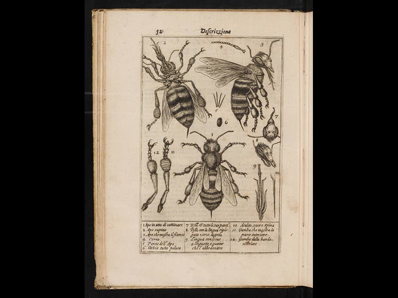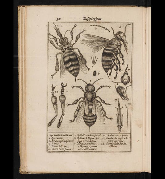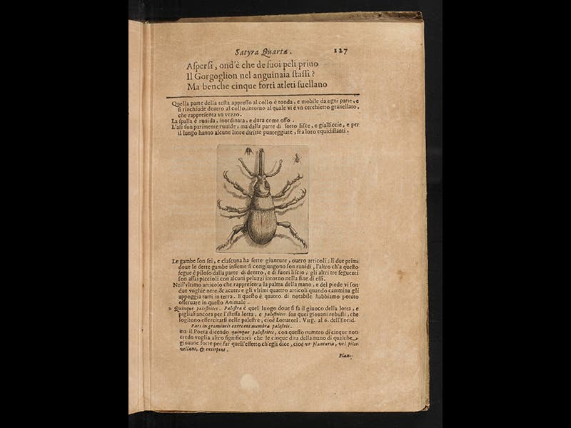 Stellutti was one of the first to use a microscope to study nature (the instrument was invented by Galileo in the 1610s). In 1625, he published a broadsheet that depicted three bees, as seen through a microscope (by no coincidence, three bees made up the family crest of the new Pope, Urban VIII). The Library does not have the broadsheet, which is very scarce, but we do have Stelluti's edition of the Satires of the Roman poet Persius Flaccus (1630), where one can find, unexpectedly, a reduced version of the engraving of the microscopically-viewed three bees (first image above). This marks the first depiction in a printed book of an object as seen through the microscope. A little bit further in the book, one encounters, just as unexpectedly, a magnified weevil (second image above).