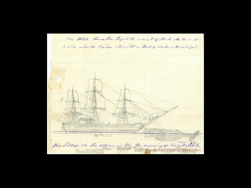 Having survived this unprecedented encounter between whale and whalers, Chase published an account of the ramming, Narrative of the Most Extraordinary and Distressing Shipwreck of the Whale-Ship Essex (1821; second image).  Herman Melville was only one year old when the Essex went down, but in the 1840s, he read Chase's book, and he also met Pollard back in Nantucket and was greatly impressed by the captain.  There were other narratives that also influenced Melville, but there is little doubt that the ramming of the Essex was a major inspiration for Moby-Dick (1851).