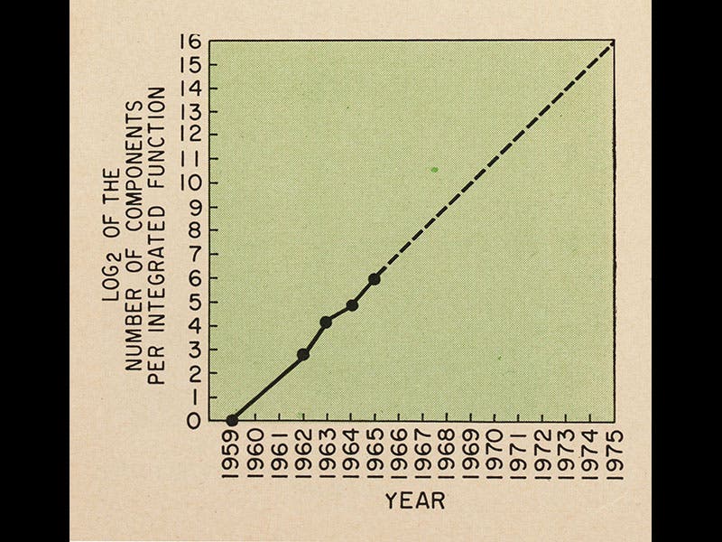 On April 19, 1965, the latest issue of Electronics magazine went on sale (second image). It contained a short 4-page article by Gordon Earle Moore, called "Cramming more components onto integrated circuits", in which Moore predicted that integrated circuits of the future would have more and more transistors packed onto their surfaces, at such a rate that the transistor number per unit area would double every year (third image). Moore even provided a graph showing past trends (solid line) and future predictions (first image). The trend held true for ten years, but in 1975 Moore revised his prediction to a doubling every two years instead of one.