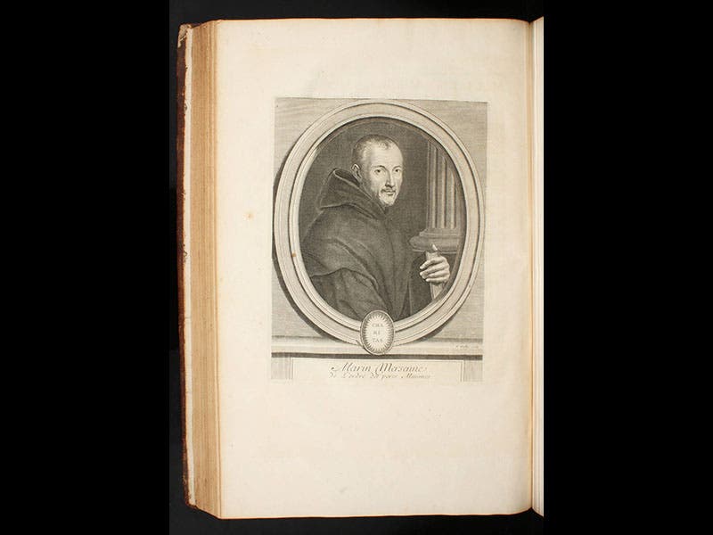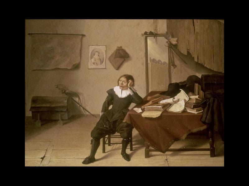 There seem to be no memorials to Beeckman anywhere, not in Middelburg, not in Dordrecht, not even in Breda, which seems a shame. When Klaas van Berkel published his excellent study, Isaac Beeckman on Matter and Motion, in 2013, his cover illustration was Jan Davidsz de Heem’s painting, Young Man Seated at a Table (1628; now in the Ashmolean Museum at Oxford). There is no reason to think that the young man is Beeckman, but the date is about right, so in lieu of an actual Beeckman portrait, we lead with the Young Man. Our other images show the figures on whom Beeckman had such an impact: Pierre Gassendi, Marin Mersenne, and René Descartes. All three of these engraved portraits are from Charles Perrault, Les hommes illustres (1696-1700), in our History of Science Collection.