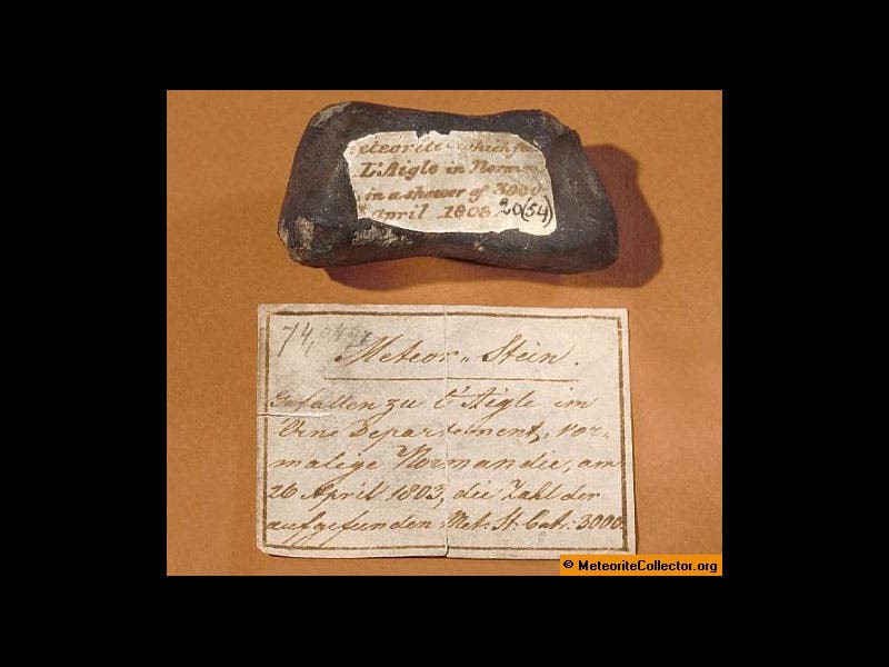Jean-Baptiste Biot, a French physicist and astronomer, was born Apr. 21, 1774. In Biot's day, the extraterrestrial origin of meteorites was a hotly-debated topic. Ernst Chladni in 1794 had first proposed the idea that meteorites come from outer space, but many preferred to believe that meteorites were either the explosive products of volcanic eruptions, or concretions that formed in the atmosphere, like hail. On Apr. 26, 1803, reports came out of a small French town called L'Aigle that a rain of stones had fallen from the sky. We see above photographs of two of the 3000-odd meteorites that were collected that day (first and second images).
