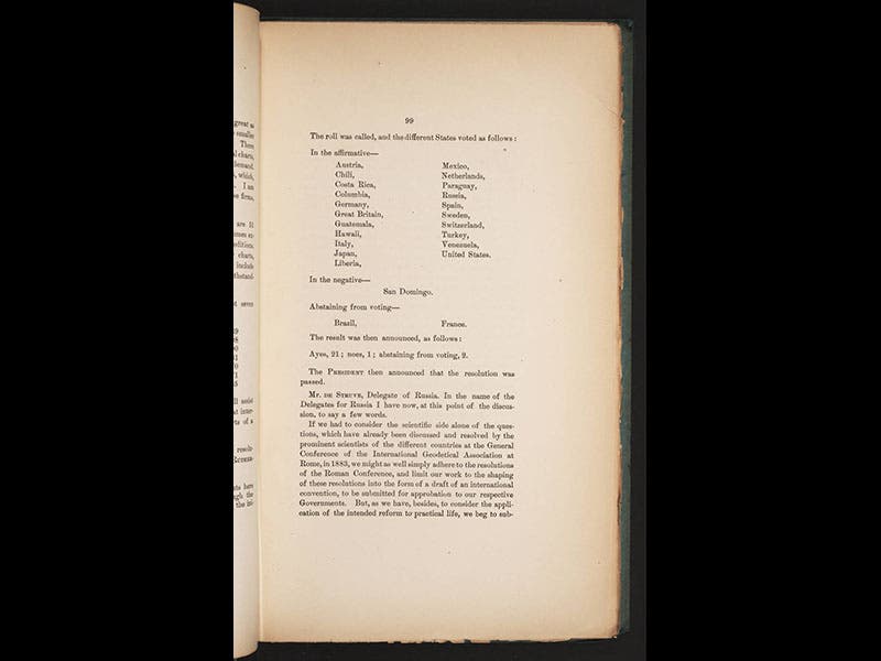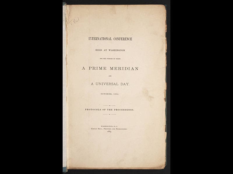 The principal trouble-makers were the French, represented by Jules Janssen (fifth image). They realized they could not rationally argue for Paris, since the Paris Observatory was now in the center of a large city and almost unusable because of the crowding and light pollution. But they did not really want England to prevail, so they lobbied for a neutral site, not belonging to any of the great powers, with a meridian not passing through any of the major continents. The westernmost of the Canary Islands, they thought, would do just fine. But in the vote of Oct. 13, Greenwich prevailed, by a vote of 22-1 (sixth image). To be more precise, the Prime Meridian was established as the line that passes through the transit instrument at the Royal Observatory in Greenwich. The lone dissenter was not France (which abstained) but San Domingo. The vote was not binding, but most governments accepted the decision with a sigh of relief. The Protocols of the Proceedings of the conference is in our History of Science Collection (first image), and it is a surprisingly engaging document to read. The general tone is rational, intelligent, and civil, in spite of the difference of opinion, so it provides a thoughtful counterpoint to much of contemporary political debate.