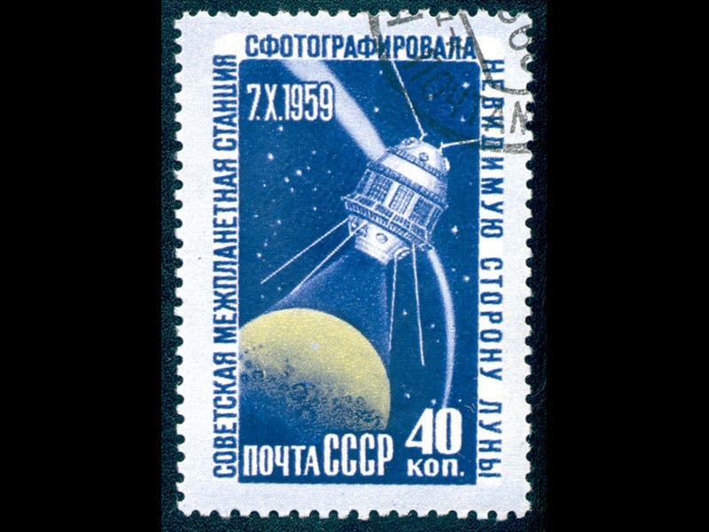 On Oct. 7, 1959, a Soviet spacecraft, Luna 3, took the very first photos of the far side of the Moon. The small probe (second image) had been launched on Oct. 4, 1959, two years to the day after the first great Soviet space triumph, the launch of Sputnik. The Soviets had tried twice before to reach the Moon; Luna 1 missed entirely, and Luna 2 crashed into the lunar surface. But Luna 3 managed to loop around the Moon and took a total of 29 grainy photos of the back side. These were transmitted to the Soviet space center several weeks later, when Luna 3 was closer to Earth.