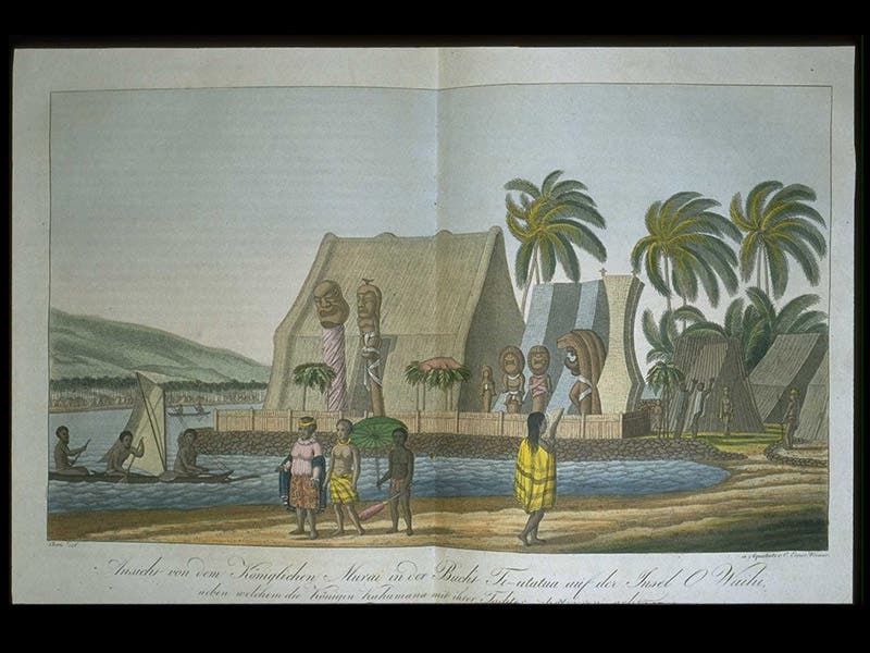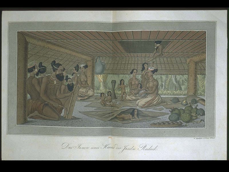 But they did make it down the west coast of North America, and then to the Hawaiian Islands, which had been discovered not long before by Captain Cook, before finally completing a circumnavigation of the globe in 1818. The narrative of Kotzebue's journey, Entdeckungs-Reise in die Süd-See und nach der Berings-Strasse (A Voyage to the South Seas and into Bering’s Strait, 1821) is in the History of Science Collection, and was displayed in our 2002 exhibition, Voyages. The first three plates above are from the Narrative and show a royal palace on Hawaii; some butterflies captured in the Hawaiian Islands, and the interior of a native hut in the Marshall Islands. The fourth image shows that path of the Rurik as it navigated around the world.