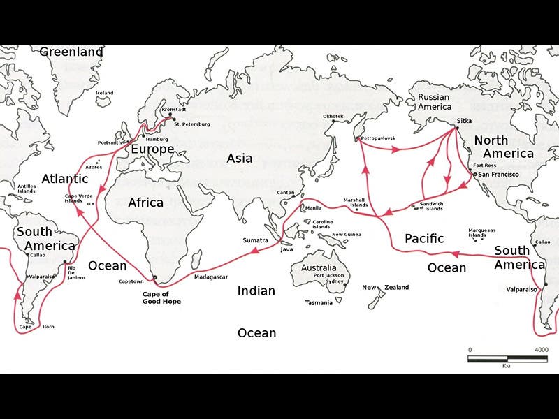 Otto von Kotzebue, an Estonian-born officer in the Russian navy, was born Dec. 30, 1787. In 1815, he set out from Finland as commander of the small brig Rurik to search for a passage from the Bering Strait across the Arctic to Baffin Bay (this was 3 years before the British would begin a series of similar searches from the other side). Among his crew of 32 (a surprisingly small number for such an undertaking), he had two naturalists, thus qualifying the voyage of the Rurik as a scientific voyage. After navigating around South America and up the extent of the Pacific, the Rurik finally arrived at Kamchatka, which was the first time that Kotzebue, a Russian commander, had ever set foot on Russian soil. Although he made it up to (and discovered) Kotzebue Sound in northern Alaska, it proved to be a dead end, and the Rurik never got any further east.