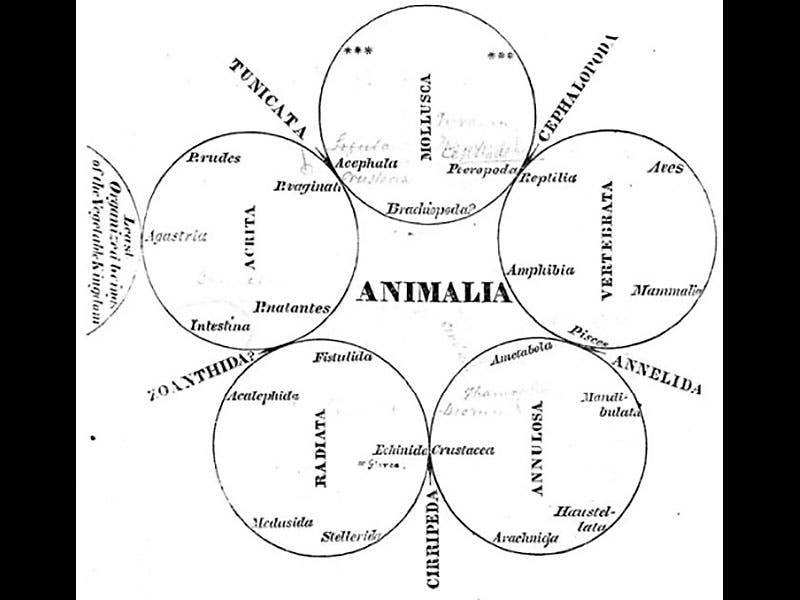 If all this sounds very mysterious, just take a peek at our second image, and you will see why graphical display can often be greatly superior to verbal description. Macleay first presented the quinarian system in his Horae Entomologicae (1819-21), and it was quickly championed by a number of British naturalists, especially Nicholas Vigors and William Swainson. But the method was soon criticized by others as artificial, and then Darwin killed it off for good with his proposal of evolutionary descent.