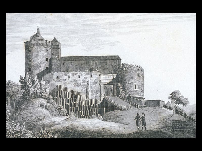 Other geologists proposed that basalt and granite are igneous rocks and were solidified from molten rock, but Werner, who had never seen an active volcanic region, rejected the idea; the only basalt he knew, at nearby Stolpen (see first image above), was found in layers, sandwiched between strata of limestone, and it was more logical to conclude that the basalt had precipitated from water, just like the limestone. The controversy over the origin of basalt would not be resolved until the 1830s, long after Werner’s death in 1817, and it would not be resolved in Werner’s favor.