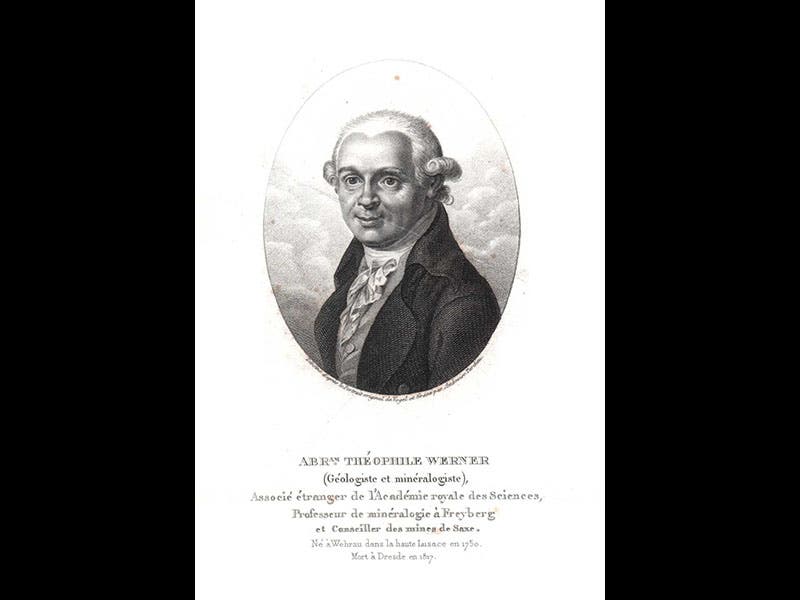 There is a commemorative bust of Werner in a park in Freiberg (second image), and a nice portrait somewhere in the same city (third image). The portrait most often reproduced appeared in one of his books (fourth image), and makes him look goofy, but Werner was far from being a goofball. He and Linnaeus were the two most popular teachers in all of Europe in the 18th century, so he was clearly a master at pedagogy, and he really did know his minerals inside and out. Had he lived in Scotland, or Italy, he probably would have reached quite different conclusions about the origins of crystalline rocks such as basalt.