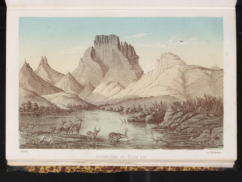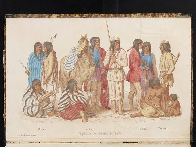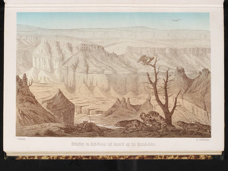Some of his drawings were used for the official Report of the expedition, written by Ives, but not many. So Möllhausen returned to Germany and published his own narrative with his own illustrations, Reisen in die Feldengebirge Nord-Amerikas (Travels into the Rocky Mountains of North America, 1861). We have this two-volume set in the History of Science Collection, and the images above were selected from the many hand-tinted plates that appear in Möllhausen’s narrative.