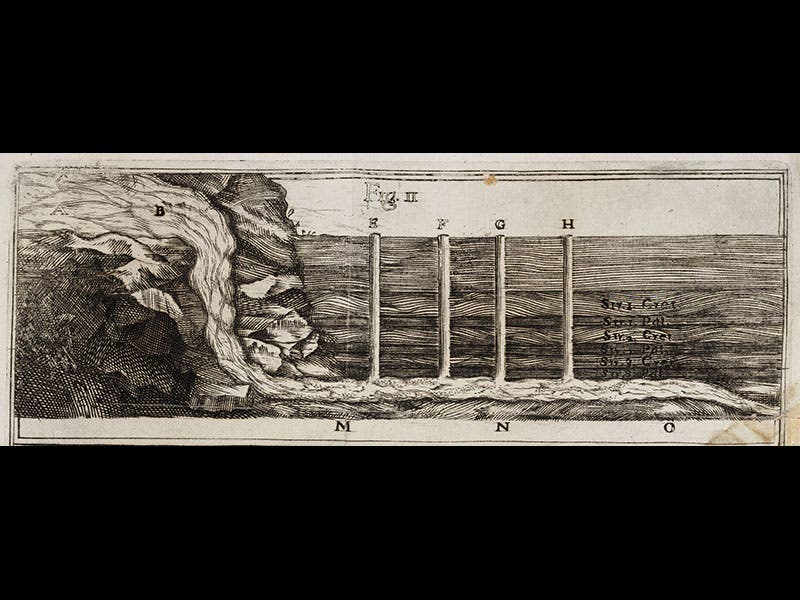 Bernardino Ramazzini, an Italian physician, was born Nov. 3, 1633. Look up Ramazzini in any online biography and you will learn that he was a pioneer in occupational medicine, being one of the first to recognize that different professions bring with them their own risks and illnesses (as any hatter would agree if he weren’t mad). This would seem to be a significant achievement and worthy of notice.  But we feel that Ramazzini made a much more thoughtful contribution to science when he was among the first to realize, as a result of personal observation, that the past history of the earth can be read from the geological record, an understanding shared with few other people in the 17th century. In 1691, Ramazzini published a book, De Fontium Mutinensium (The Fountains of Modena), and no, it is not about the making of balsamic vinegar, Modena's most significant contribution to world cuisine. Instead, it addresses an odd fact, that if you dig a well anywhere in Modena that is at least 50 feet deep, a fountain will spring up. Ramazzini wondered why. He never did figure that part out, although he guessed that some sort of underground river was responsible (first image).  But as he observed the digging of wells, he noted that some of the layers of soil far below the surface had seashells in them. He concluded that this could only have happened if Modena, at some time in the distant past, had been covered by the sea. There are only four early modern natural philosophers who realized that land and sea have maintained a shifty alliance and have, on occasion, changed places. Three of them--Robert Hooke, Nicolas Steno, and Gottfried Leibniz--are acclaimed for their insight.  Ramazzini came to the same conclusion and deserves to be just as well known. We did our part in 1984, when we featured Ramazzini's contribution to historical geology in our exhibition, Theories of the Earth. Apparently our catalog escaped the notice of the author of the Wikipedia article on Ramazzini and most other biographers.