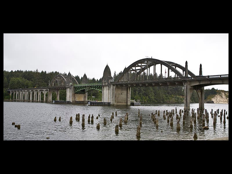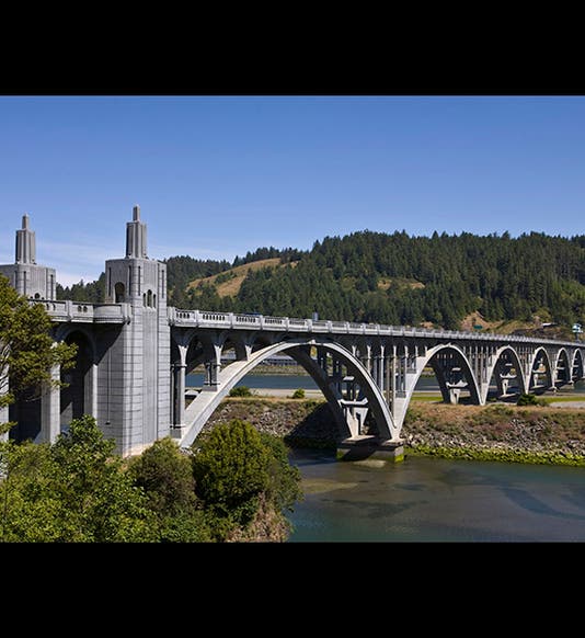 The Siuslaw River Bridge, a bascule bridge, opened in 1936 (second image). Here accommodation had to be made for shipping, so the center section opens up to allow ships to pass. Notice the pointed arches in the piers, and the Gothic-like towers on the piers for the Bascule section; McCullough liked to use Gothic elements in his bridges, as well as Art Deco, and several other styles. We show a detail of one of the Art Deco elements (third image).