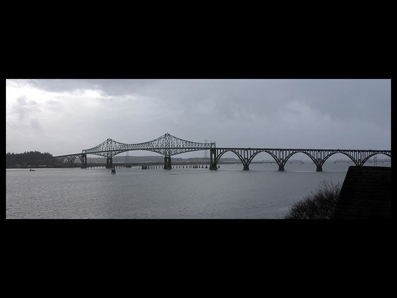 The formerly-named North Bend Bridge opened in 1936. This is a very long bridge, and very high as well, again because of the need to have open shipping lanes (fourth image). In this case the long central spans are a pair of cantilevers made of steel, while the arches on either side are concrete. This bridge does not have the aesthetic unity of the Isaac Patterson Bridge, but apparently it has done its job very well. After McCullough’s death, the name of the span was changed to the Conde B. McCullough Memorial Bridge.