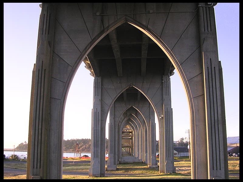 We saved everyone’s favorite McCullough bridge for last: The Yaquina Bay Bridge, which opened in 1936. What a beautiful structure (fifth and sixth images). This bridge is a through arch, with the central rainbow and the two adjacent arches made of steel, and the approach arches fashioned from concrete. In a photo of the approach arches from below (seventh image), one can see that McCullouch again combined Art Deco with Gothic. Note the detail even in the bridge’s underbelly, and the polished finish that was given to the concrete surfaces.