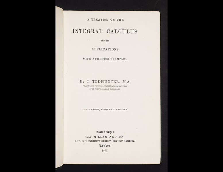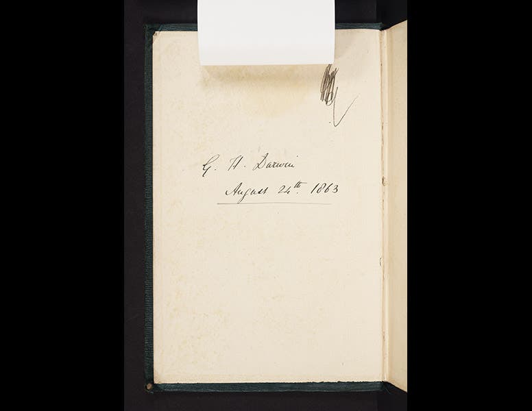 The Linda Hall Library has five books from George Darwin’s library, each signed and dated “G. H. Darwin;” all of them are math textbooks that he acquired while at Trinity College, Cambridge, in the early 1860s. An example is Isaac Todhunter, A Treatise on the Integral Calculus (1862); the inside front cover with his signature (third image) and title page (fourth image) are shown above.