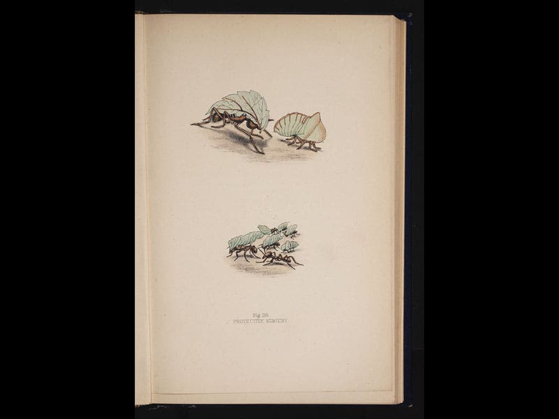 Romanes believed that geographical isolation was important in evolution, but Darwin did not, and rather than disagree with his mentor, Romanes kept quiet until after Darwin's death in 1882. Afterwards, Romanes put forward the idea of "physiological selection" to supplement Darwin's principle of natural selection, the proposal being that organisms, when they vary, lose the ability (or the desire) to mate and produce fertile offspring with their distant cousins. Just before his untimely death at age 46, Romanes published a three-volume work called Darwin and After Darwin (1892-7; third image). We have the first U.S. edition in the Library. The first volume has a frontispiece sketch of Darwin (fourth image), and many plates accompanying a section supporting natural selection as the primary evolutionary mechanism (first and fifth images). Since Romanes died before volume 2 was published, his portrait was added as a memorial frontispiece to that volume (second image).