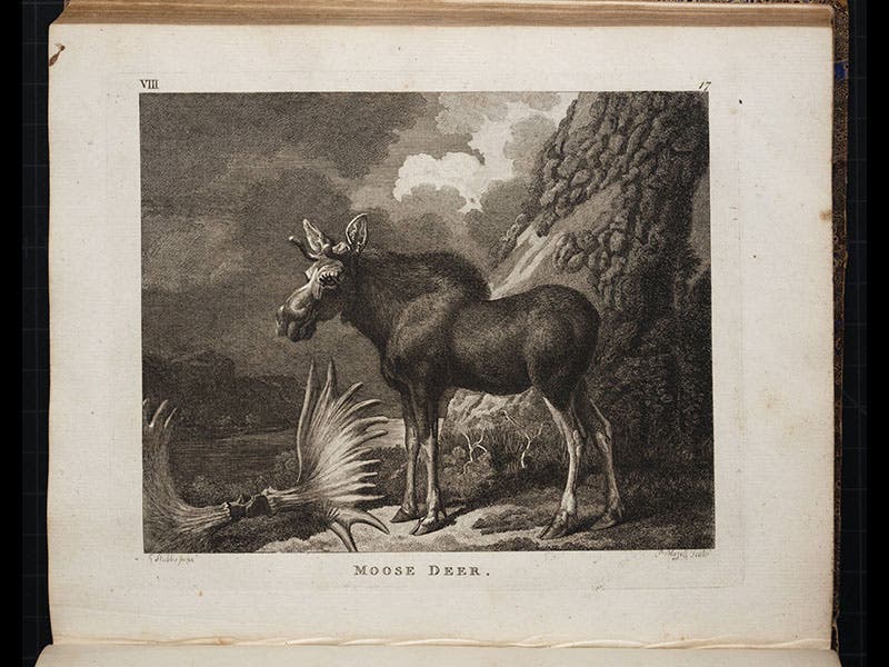 However, occasionally Stubbs got a call to paint more unusual animals. In 1770, The Duke of Richmond was presented with a young bull moose from Canada, the first to make its way to England. The anatomist William Hunter commissioned Stubbs to sketch the animal, and the result was a splendid oil painting, now in the Hunterian Art Gallery in Glasgow (second image). Since this juvenile was too young to have antlers, Stubbs thoughtfully included in his painting a set of antlers from a full-grown moose that had been given to the Duke as well. Stubbs’ moose was later engraved and included in Thomas Pennant's Arctic Zoology (1784), which we include here, because the engraver endowed the moose with a very charming set of eyelashes (third image).