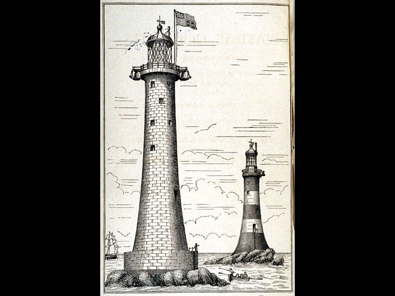 The images above show, in order: the two Eddystone lighthouses of Douglass and Smeaton in 1882, with Douglass’ in the foreground; the first (Winstanley) lighthouse of 1699, which was washed away in 1703; the second (Rudyerd) lighthouse of 1708, which burned down in 1755; the third and most famous Eddystone light, erected by Smeaton in 1759; the fourth lighthouse, that of Douglass, with the stub of Smeaton’s in the background, from a photo of 1905. The last image is a modern photo of the top of Smeaton’s lighthouse, now transported to a green in Plymouth.