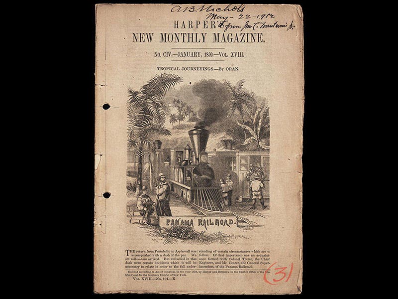 For all his fame as the one of the pioneers of Maya studies, Stephens is equally acclaimed as the father of the first Panama Railroad. There were several desultory attempts to build a railway across the Isthmus of Panama in the 1840s, so that prospective settlers of California would not have to make the long journey overland or the even longer voyage around the Horn. But the need and desirability for the railroad accelerated ten-fold with the discovery of gold at Sutter's Mill in 1848. Stephens surveyed the route for the railroad, found a pass across the mountains at Culebra, negotiated a 99 year lease with Columbia, and even arranged the $600,000 payment to secure the lease--all in six months in 1848. When the U.S. government declined to back the railway financially, Stephens and his two fellow entrepreneurs went ahead anyway. Stephens supervised the laying of every foot of track, for the rest of his short life, from his headquarters midway across the Isthmus. The Panama Railroad was completed in 1855. A copy of Harper’s New Monthly Magazine from 1859, in the collection of later Panama Canal engineer A.B. Nichols, shows the railroad in operation. The Nichols collection of Panama Canal materials is held at the Library and provided much of the display material for our 2014 centennial exhibition, The Land Divided, the World United: Building the Panama Canal.