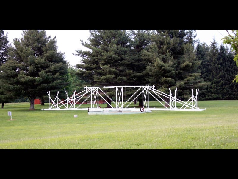 Jansky, who was not an astronomer, moved on to other projects. It is interesting that thirty years later, two other Bell Labs engineers, Arno Penzias and Robert Wilson, were also developing an antenna for communication purposes, this one a horn microwave antenna, and they too detected an unknown hiss. This one came from everywhere, and was finally identified in 1965 as cosmic background radiation left over from the Big Bang. The antenna they used was also in Holmdel. The Penzias-Wilson horn antenna is now a National Historic Landmark. Jansky’s original antenna is not to be found—at least not in Holmdel. But a monument to Jansky was dedicated at Holmdel in 1998; there is a photo of the stainless steel radio wave above, along with a detail of the plaque at the monument (see second and third images above). And there is a full-size replica of Jansky’s antenna at the National Radio Astronomy Observatory in Green Bank, West Virginia (see last image above).