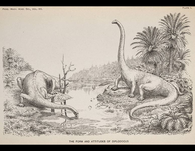 So in 1908, Hay published a paper in which he argued that dinosaurs such as Diplodocus had their legs splayed out to the side, and in 1910, he published an expanded version of his paper, accompanied by a pencil sketch (by Mary Mason Mitchell) depicting four sprawling Diplodoci (first image). Hay found immediate support from a German, Gustav Tornier, who in 1909 offered an anatomical reconstruction of Diplodocus in its new splayed stance. These two papers were then grist for a blistering attack by William J. Holland, the Director of the Carnegie Museum of Natural History, who pointed out that, given the size of the Diplodocus rib cage, nature would have had to provide lengthy troughs in the ground to accommodate the Diplodocus belly as it moved around (fourth image). Holland preferred the traditional reconstruction of 1901 (fifth image), for which he himself had been largely responsible.