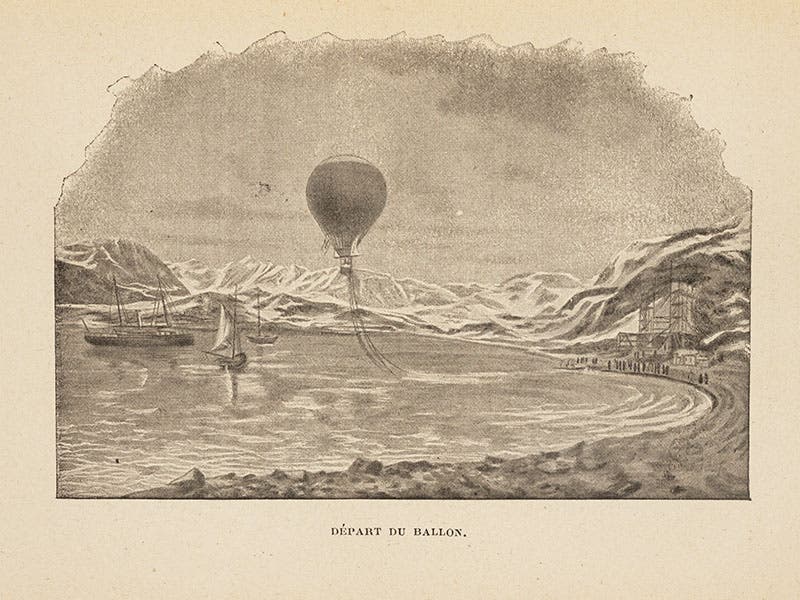 We have in our History of Science Collection a book written by the balloon manufacturer, Henri Lachambre, Andrée: Au pôle nord en ballon (1897) that was published shortly after the launch In addition to its pictorial cover (seventh image), it contains the image depicting the lift-off that introduces the photoset above. The portrait of Andrée (second image) is from a carte de visite.