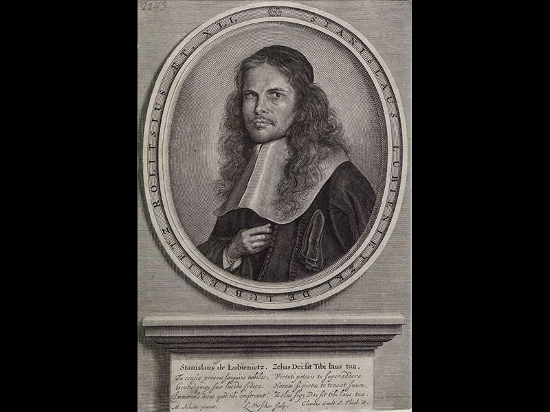 Stanislaw Lubieniecki, a Polish astronomer, died May 18, 1675, at the age of 51. Stanislaw's hometown of Rakow (Racovia in Latin) was a hotbed of Socinianism—an essentially Unitarian sect. The Racovian Academy, a Socinian school, attracted students from all over Europe and had an enrollment of over 1000. In 1638, the Catholic bishop in nearby Cracow had had enough, and he outlawed the sect, closed the Academy, destroyed much of the town, and sent most of the intellectuals fleeing to places like Transylvania, or, in Stanislaws's case, the Netherlands, and eventually, Hamburg, Germany, where he had the pleasure of being persecuted by the Lutherans instead.