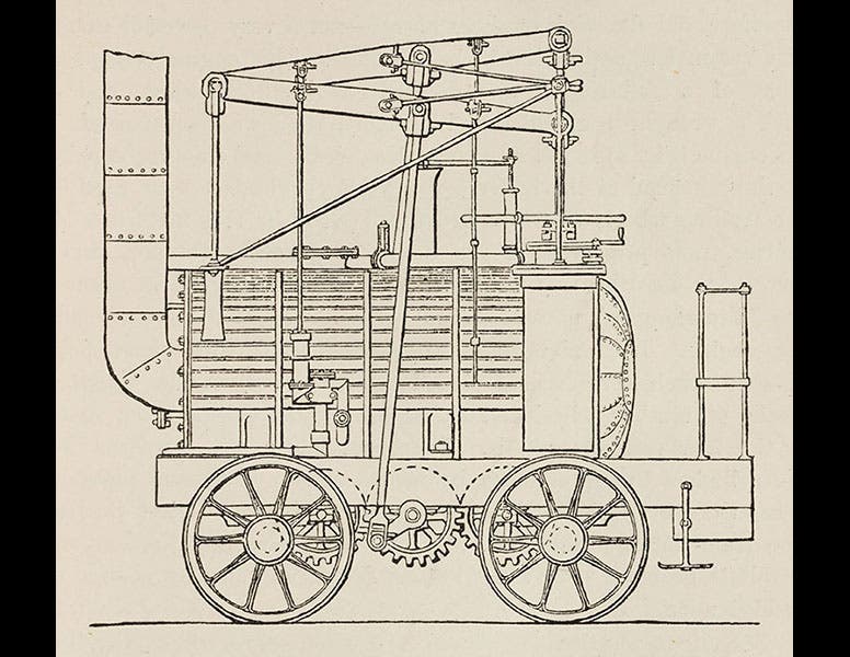Puffing Billy served as inspiration for George and Robert Stephenson when they designed and built their famous Rocket some years later. They dispensed with the grasshopper beams, but otherwise the resemblance between the two is strong. There is a handsome wood engraving of the Rocket reproduced on the cover of the brochure for our 2008 exhibition, Locomotion (fifth image).