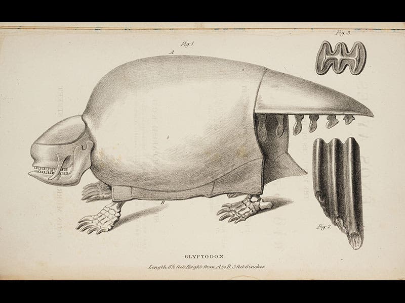 After his return from Buenos Aires, Parish wrote and published a book, Buenos Ayres and the Provinces of the Rio de la Plata (1839). There is a hand-colored lithograph of his Megatherium skeleton in the text (fourth image), along with a pink-fairy armadillo (third image), and the newly-named Glyptodon is depicted on the frontispiece, the first time it had been illustrated anywhere (first image). We have Parish's book (and Clift's earlier paper) in our History of Science Collection. The finest illustration in the book is the hand-colored map of southern South America, which we include above as well.