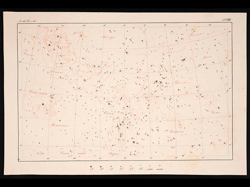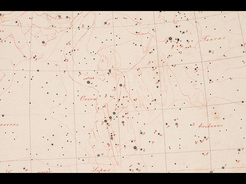 Friedrich Argelander, a German astronomer, was born Mar. 22, 1799. In 1843, Argelander published a star atlas, with titles in both Latin and German, Neue Uranometrie/ Uranometria nova (fourth image). The titles were a deliberate choice. Back in 1603, another German, Johann Bayer, had published the first modern star atlas, which he titled Uranometria, with elegant constellation figures and star positions determined by Tycho Brahe. We see above a plate from that atlas, showing the constellation Orion (fifth image). Note how heavy-handed it was: strong constellation outlines, and stars that almost seemed to explode off the page. Since Bayer's Uranometria, there had been scores of celestial atlases published. New constellations were proposed, which jostled for position with the classical figures. More and more stars were discovered, and they found their way onto star plates as well, with some atlases having over 17,000 stars depicted (Bayer had recorded just over 1000).