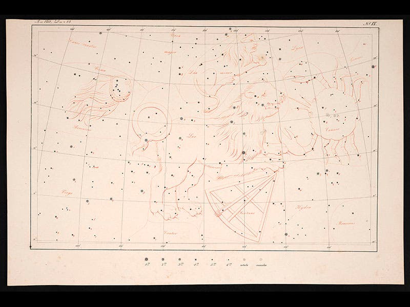 Argelander chose to return to the days of the original Uranometria, by limiting his atlas to the visible stars. But he also wanted to recognize that the constellations were not the show-stoppers anymore--the stars were. So Argelander's star atlas depicted the constellations with very faint outlines, and to emphasize the connection with Bayer's Uranometria, he used the very same figures that Bayer had used, as we see with Argelander’s version of Orion (second image, with first image detail). When he had to add constellations that Bayer did not employ, as with the 10 constellations invented by Johannes Hevelius, he did not copy Hevelius, but rather provided new figures in the style of Bayer (third image, where Leo minor and the Sextant are new constellations, and Cancer and Leo are traditional). The novel feature of the Uranometria nova was the star positions; no splashy stars, instead there are small dots, very accurately placed. Argelander's Uranometria nova is at once the last of the constellation-dominated grand atlases, and the first of a new kind of professional star atlas, designed for the single purpose of positioning the stars on a grid that will be useful to the observatory astronomer.