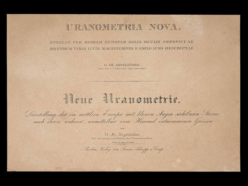 Many years ago we displayed an exhibition of celestial atlases, Out of This World: The Golden Age of the Celestial Atlas. The Golden Age began with Bayer, and it ended with Argelander, as the Uranometria nova was the last atlas in our exhibition. We produced a lovely printed catalog, but time has not been kind to the electronic version, one of the first of its kind on the web, and it badly needs a face lift. Nevertheless, here is the page on Bayer’s Uranometria, and the final page, featuring Argelander’s Uranometria nova.