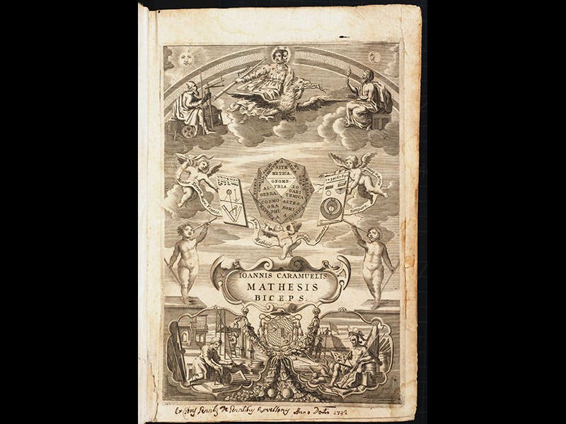 One of the plates depicts the geocentric Tychonic cosmological system (fourth image), which Caramuel, like the Jesuits, apparently favored. We can tell this because on another plate, where the Copernican and Ptolemaic cosmologies are also shown, the Tychonic on the right is made slightly larger (fifth image). On the emblematic title page (first image), the two heads of the mathematical muse at top represent Theory and Practice, and she was inspired by the emblem of the Habsburg emperor, a two-headed eagle.