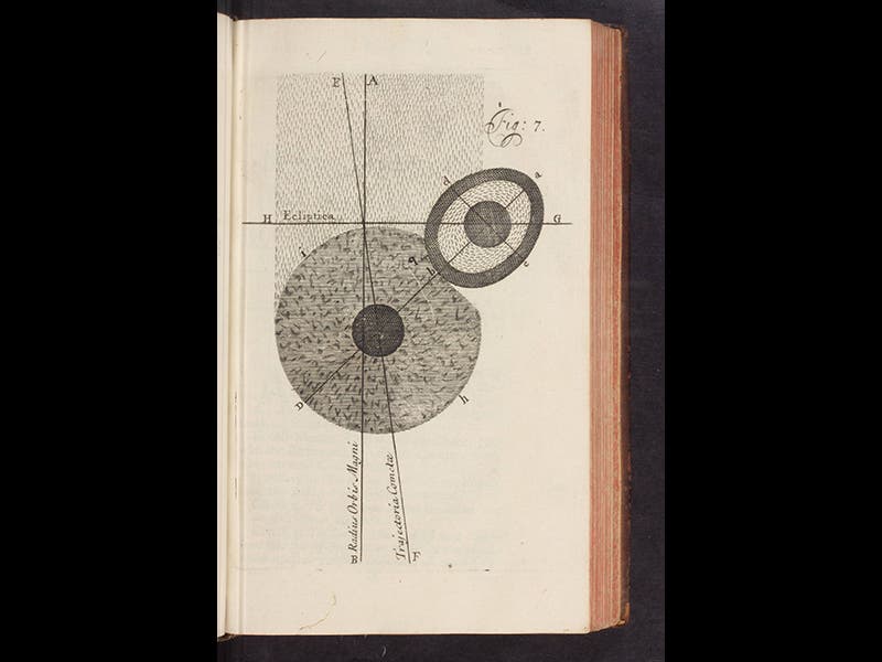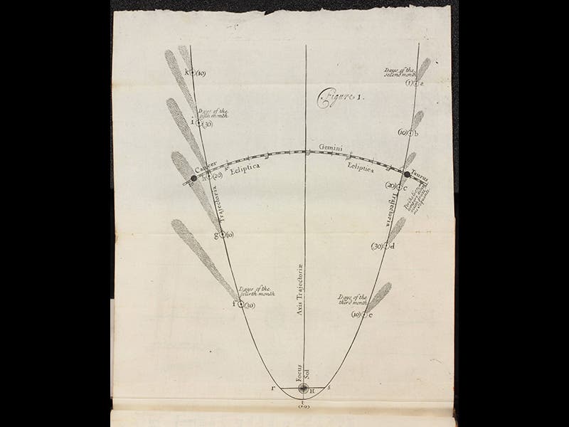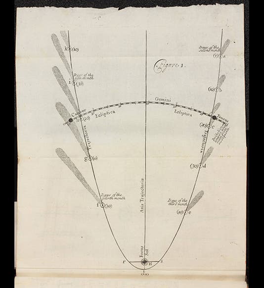 William Whiston, an English physicist, was born Dec. 9, 1667. Whiston was the third Lucasian Professor of Mathematics at Cambridge, succeeding Isaac Newton, who resigned in 1701 to become Master of the Mint. In 1696, Whiston published A New Theory of the Earth, which attempted to explain the origins of the great Flood of Noah (see title page above, third image). Whiston proposed that the Flood was caused by a comet, which passed very close to the earth (see the diagram of the comet’s orbit, first image above). The crust of the earth cracked open from the gravitational interaction (Whiston was a Newtonian), releasing the waters of the deep, and the watery tail of the comet caused the 40 days of rain (second image above).