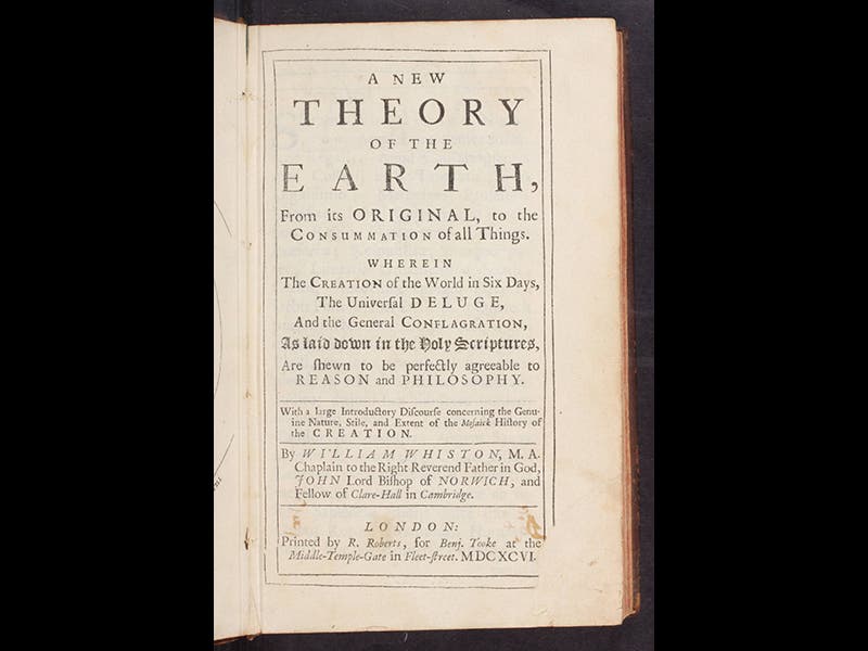 Whiston's book was a Newtonian alternative to the Cartesian theory of the earth that had been proposed by Thomas Burnet in 1681, according to which the earth was a cooling star that dried out and cracked open, releasing the subterranean waters to cause the Flood. Whiston's New Theory had the approval of Isaac Newton, and led to his Lucasian Professorship, but in the ensuing years Whiston made public the fact that he was anti-Trinitarian in his religion, and because of this, he was removed from his faculty post in 1710 and ushered out of Cambridge, and Newton helped show him the door. The odd thing was, Newton was also an anti-Trinitarian, with views similar to Whiston's, only he kept his religious radicalism a secret. Newton never was much for putting himself on the line for his friends. Which, I suppose, is why he had very few friends.