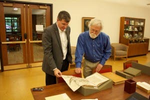 Photo: Steve Stich (left) and Dr. William Ashworth view Johannes Kepler’s Mysterium Cosmographicum (Cosmographic Mysteries), 2nd edition, 1621.