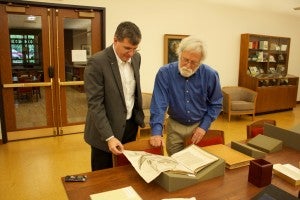 Photo: Steve Stich (left) and Dr. William Ashworth view Johannes Kepler’s Mysterium Cosmographicum (Cosmographic Mysteries), 2nd edition, 1621.