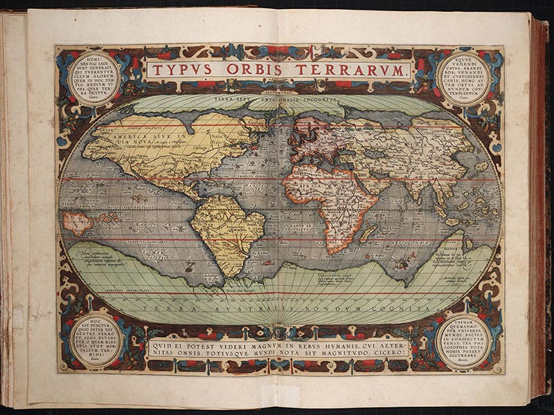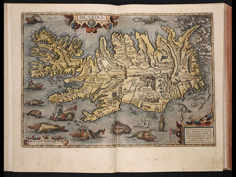 The Theatrum was an immediate publishing success, and it went through 23 editions and translations in Ortelius’ own lifetime (he died in 1598). It also made the previously poor Ortelius a great deal of money, which meant he could now afford to travel and collect geographical information and improve his maps. The Library’s copy of the Theatrum is the 1592 edition, considerably enlarged from that of 1570 (134 maps instead of 53). We reproduce above: the world map (considerably improved from that of 1570); a map of the New World (second image above); and the map of Iceland, charming because of the many ferocious sea beasties that fill the North Atlantic south of the island (third image).