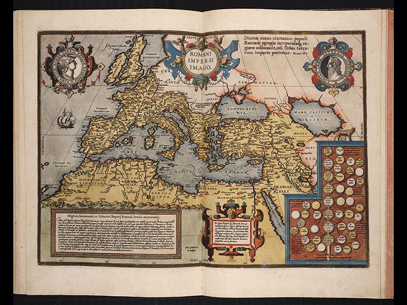The second part of the Theatrum contained historical maps, depicting the world as known to ancient geographers, such as a map of the Roman Empire at its greatest extent (fourth image). One of the most arresting engravings in the Theatrum shows the world as mapped by Ptolemy of Alexandria, superimposed on the much larger world known to Ortelius (fifth image).