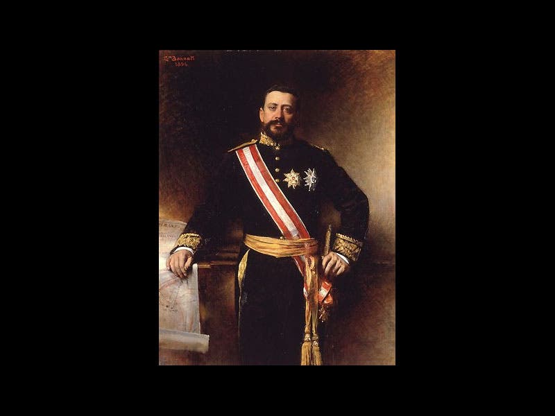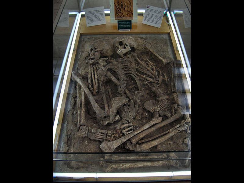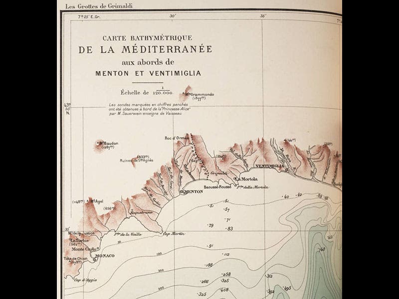Albert Grimaldi, who became Albert I, the 10th Prince of Monaco, was born Nov. 13, 1848 (see first image above). Albert was a great patron of the sciences, especially anthropology; he founded the Museum of Prehistoric Anthropology of Monaco and the Institute of Human Paleontology in Paris. During his reign (1889-1922), a number of caves were discovered along the coast near Menton, just east of Monaco; they contained prehistoric remains and artifacts, and they were promptly named the Grimaldi Caves, after the Prince (for a map, see second image; for a view of several of the grottos, see third image). A pair of human skeletons was unearthed in one of the caves, called Baousse-Rousse, the “Red Cliffs”. In the tradition of giving catchy names to important specimens (Neanderthal man, Java man), the skeletons from Baousse-Rousse were called "Grimaldi man.” Grimaldi man, however, became quite controversial; the discoverers thought they saw certain negroid features in the specimens, and they were reconstructed with protruding jaws that, it turns out, the evidence does not really justify. Also, the two skeletons consist of an adolescent man and an older woman; when found, the young man was face up and the woman face down, but they were reconstructed in a "spoons" position, as if they had been buried like that (fourth image). The side view also allowed the jutting jaws to be visible. And that is the way they are displayed to this very day in the Monaco Museum, with a disclaimer about the mistakes in reconstruction (fifth image). The disclaimer, however, is not very apologetic. And the erroneous display remains uncorrected.