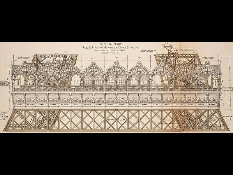 It is not often realized, even by visitors, that Eiffel chose to honor 72 eminent French scientists and engineers and had their names engraved on a narrow frieze that runs around the tower, just below the first stage. The names were accidently painted over and forgotten in the early 20th century, but in 1986 they were re-discovered and restored to readability. In one of his diagrams of the structure of the tower, Eiffel shows us one side, with 18 of the names drawn in (see sixth image above).