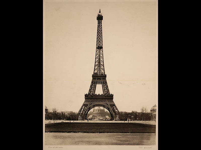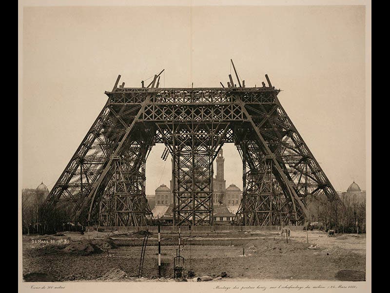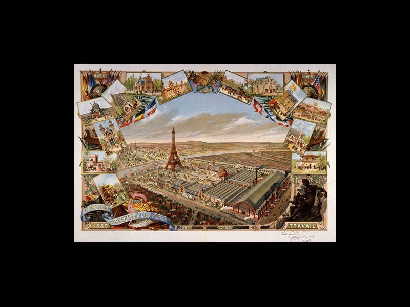 Alexandre Gustave Eiffel, a French structural engineer, was born Dec. 15, 1832. In 1886, to highlight the upcoming world’s fair in Paris in 1889, Eiffel proposed building a 300 meter iron tower on the Champs Mars to overlook the exposition grounds. Work on the tower started in 1887, and by March of 1889, the structure was completed. Some years later, Eiffel published a large two-volume folio documenting the construction process, and the second volume contains diagrams of every detail of the tower (and of the elevators that ran up two of the legs), as well as photographs of the tower as it rose from the ground. The first three images above are taken from that volume, and show stages of the construction. Image four shows a view of the cathedral of Notre Dame, as seen from the top of the completed tower. The fifth image, a contemporary postcard, shows us how the Eiffel Tower fit into the exposition grounds.