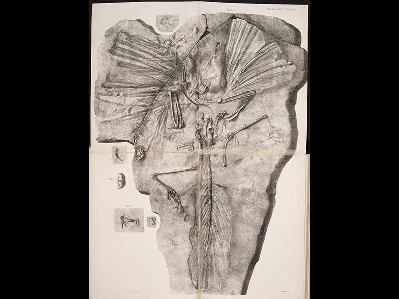 In 1861, another fossil was found in Solnhofen, Bavaria, where most of the world's lithographic limestone was mined. This fossil was about the size of Compsognathus, but the fossil slab gave clear evidence that it had feathered wings and a feathered tail. It was named Archaeopteryx (“ancient wing”), but before Wagner could see it, the fossil was sold to the British Museum in London, where it became famous as a possible missing link, connecting birds and dinosaurs. Although he had only a description provided by an assistant, Wagner wrote a paper on the feathered fossil, in which he argued strongly that it was not even close to being a bird, and he warned "Darwinians" not to try to make too much of the fossil. He even provided what he thought was a better name, Griphosaurus, which means "enigmatic lizard". Given that paleontologists are still arguing about the status of Archaeopteryx, perhaps we should have adopted Wagner’s name. A splendid engraving was commissioned for Richard Owen’s 1863 paper on Archaeopteryx, and we displayed that as well in our exhibition (third image).