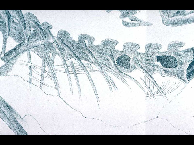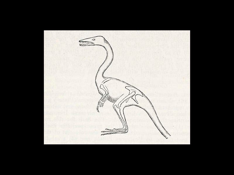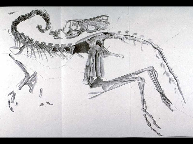 Wagner did not notice the presence of a small reptile skeleton within the ribs of Compsognathus (fourth image). Forty years later, Baron Nopcsa decided that these were the bones of a tiny lizard, remnants of Compsognathus’ last meal, a paper that we did not exhibit for Paper Dinosaurs, but which we added to the online version of that exhibition.