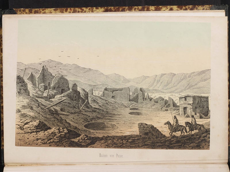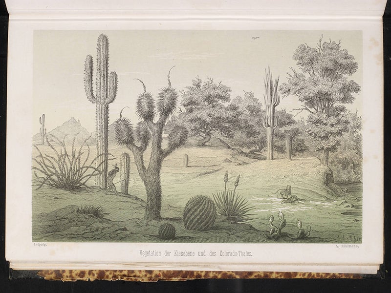 Some of his drawings were used for the official Report of the expedition, written by Ives, but not many. So Möllhausen returned to Germany and published his own narrative with his own illustrations, Reisen in die Feldengebirge Nord-Amerikas (Travels into the Rocky Mountains of North America, 1861). We have this two-volume set in the History of Science Collection, and the images above were selected from the many hand-tinted plates that appear in Möllhausen’s narrative.